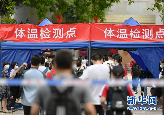 7月7日,在福州第二中学考点,考生进入考场前有序通过体温检测点。 当日,2020年高考拉开帷幕。 新华社记者 魏培全 摄